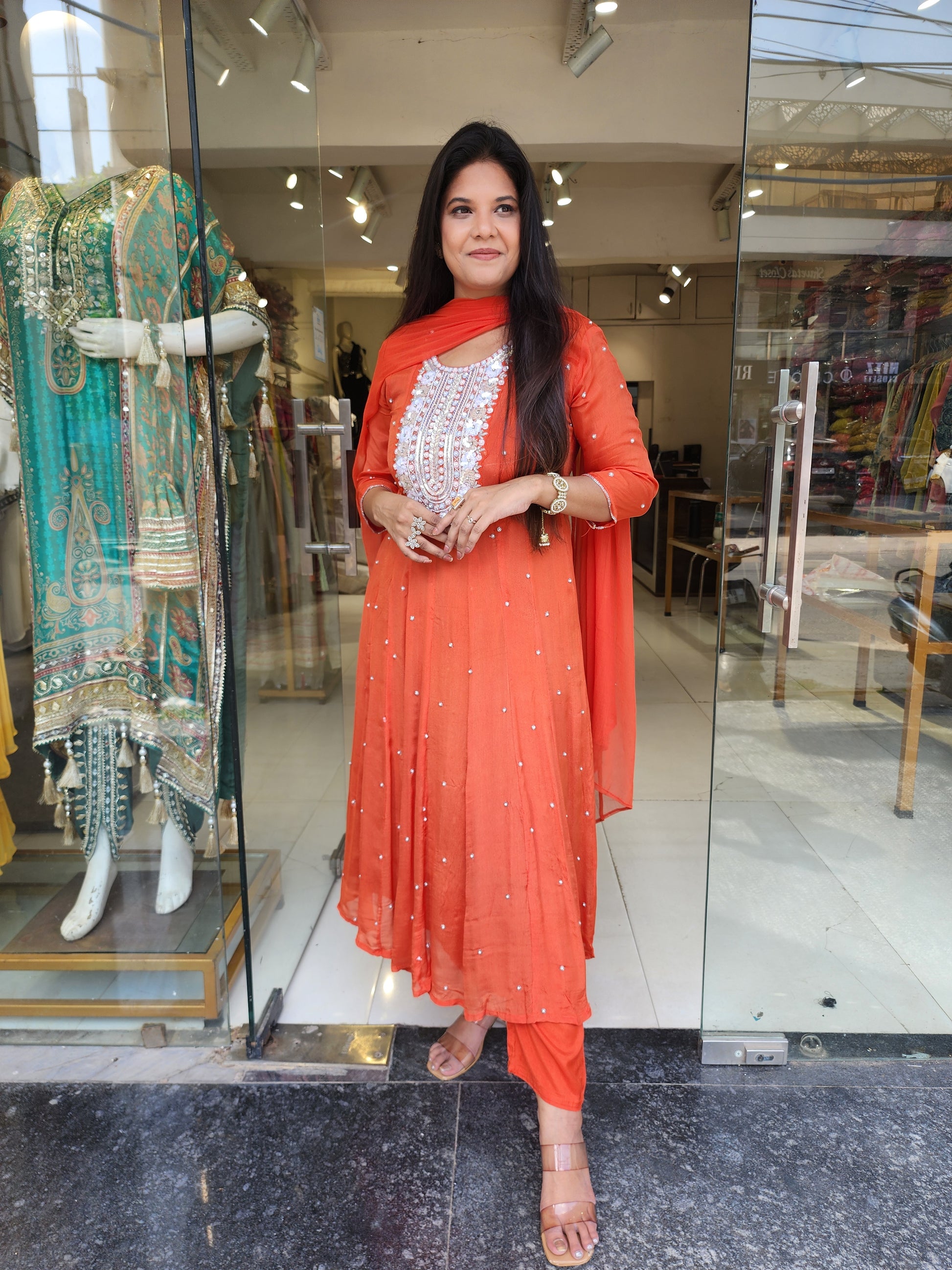 Orange anarkali suit with pant and dupatta